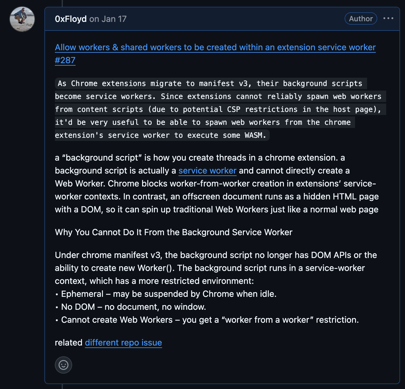 One of the trickier parts of developing this extension was performing the heavy WASM computation required for proof generation. For this, we used Chrome's Offscreen Document capability. An offscreen document is a hidden extension page (with a DOM and full web context) that we can create on the fly. It runs in the background without a UI, but unlike the service worker, it can use web APIs. The background script cannot spawn Web Workers - attempting this causes a "worker in a worker" error. Offscreen being a full Window context means we can spawn Workers there, and run WebAssembly (WASM) in a multi-threaded environment. Proof generation is very CPU-intensive and takes a while. It was not possible to run the heavy WASM execution elsewhere. Running WASM execution in other contexts hangs the main thread. Offscreen provides a separate context that can churn on the CPU without blocking the main event loop.