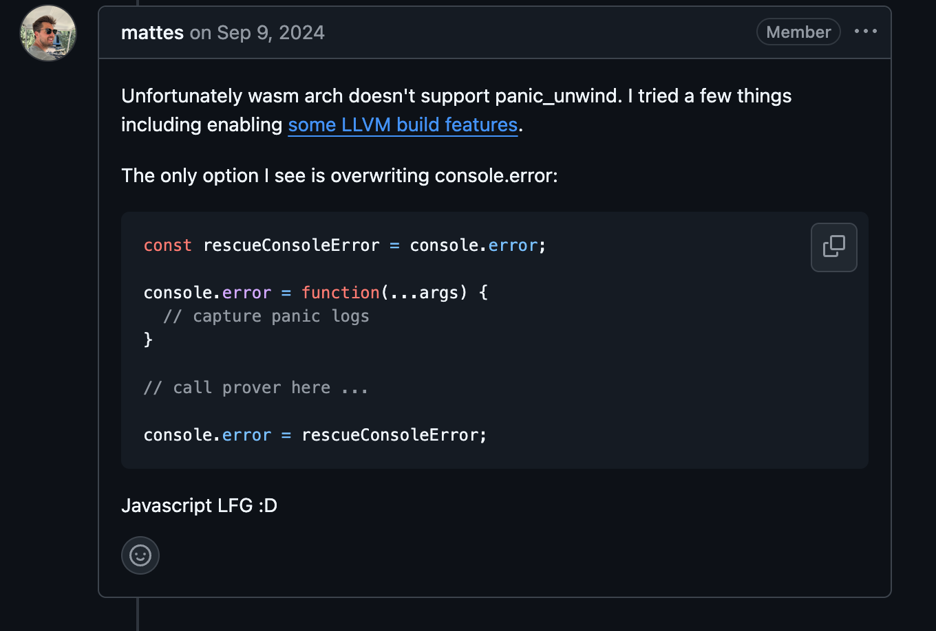 console.errorto grab WASM "panicked" messages—since WASM panics aren't caught through normaltry/catch.