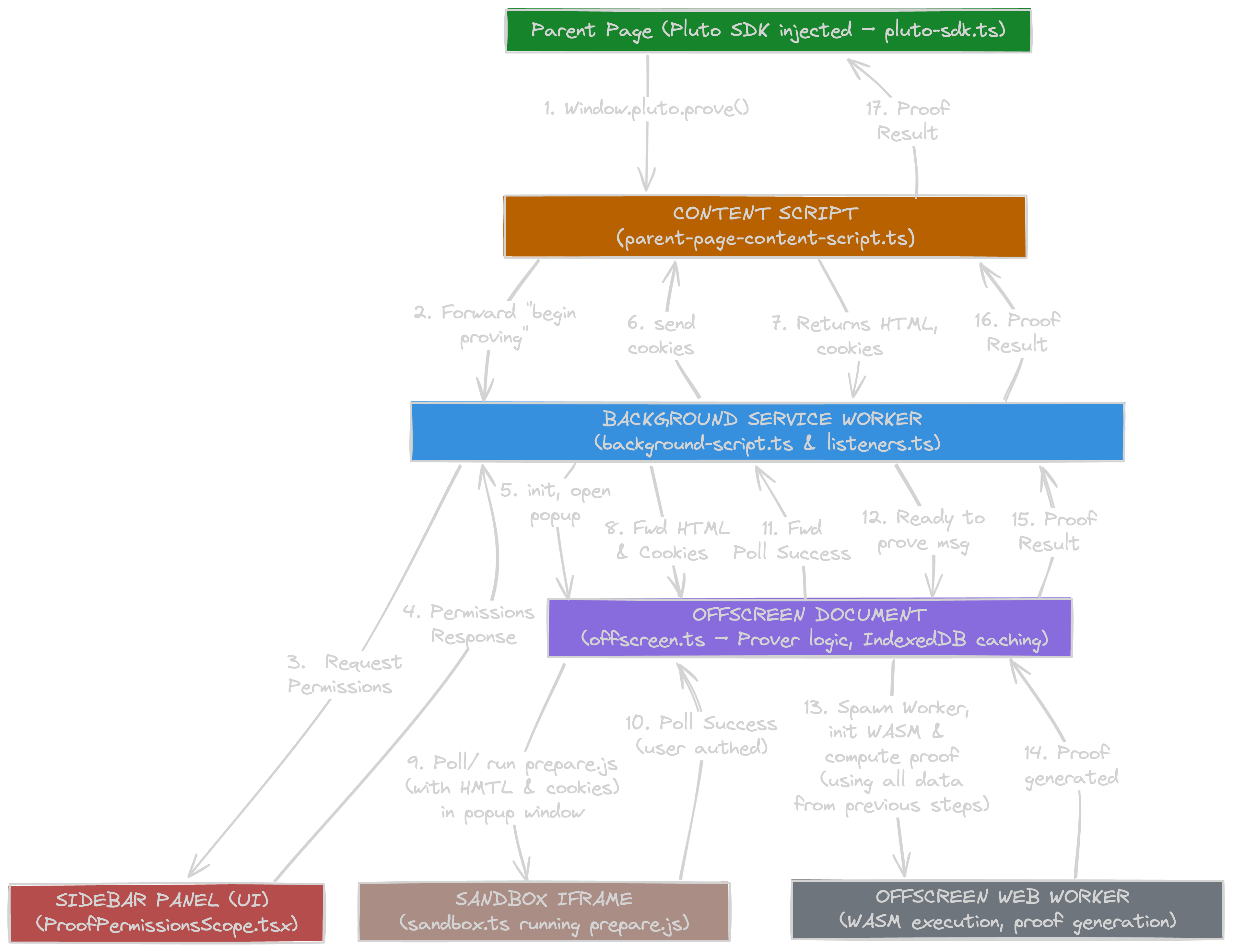 TL;DR: Pluto's Chrome extension enables users to generate "Web Proofs" – our term for cryptographic attestations of public or authenticated data (e.g. verifying your Venmo balance or amazon purchase) – directly in the browser with strong privacy guarantees. Web Proofs allow users to privately and verifiably demonstrate facts about their online data without exposing personal details. In this post, I'll dive into the extension's architecture and the technical decisions behind it, focusing on how we leveraged Chrome's multi-context extension model, WebAssembly for the computationally expensive proof generation, and various browser APIs to securely prove web data.